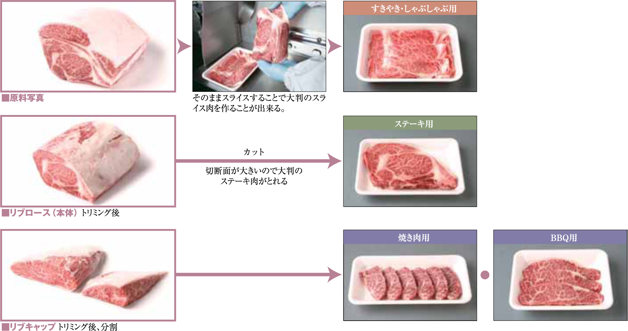 商品提案 Product proposal まえ ロース バラ もも リブロース (Ribloin) 原料肉概要 「リブロース」は、「かたロース」から続く「ロース」部分で、肋骨(リブ)部の背中にあたり、肉の厚みもあり、きめも細かくやわらかいのが特徴です。 また、脂肪交雑が入りやすいので、風味が豊かです。 料理用途 PRIMAL CUT PETAIL CUT