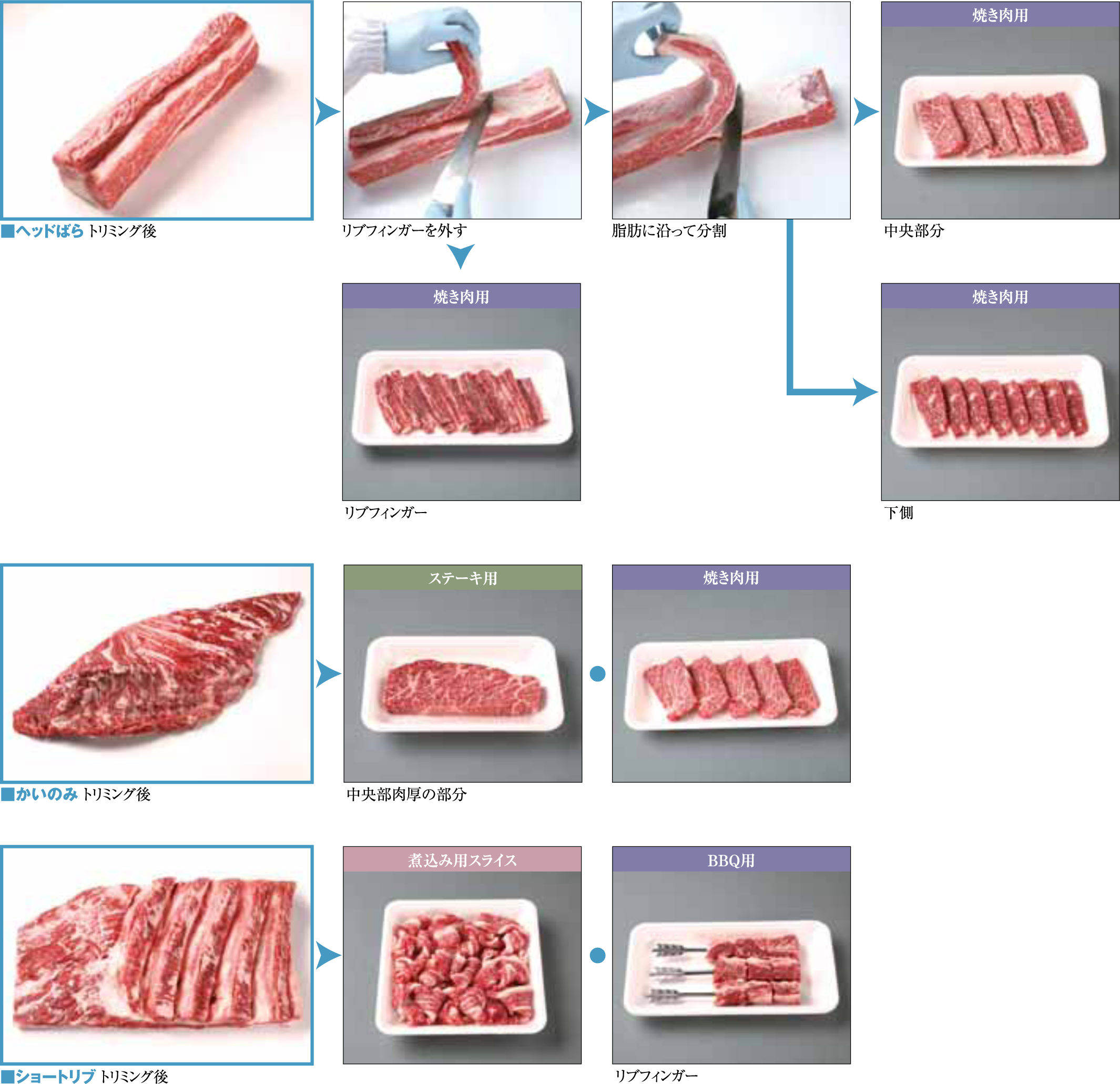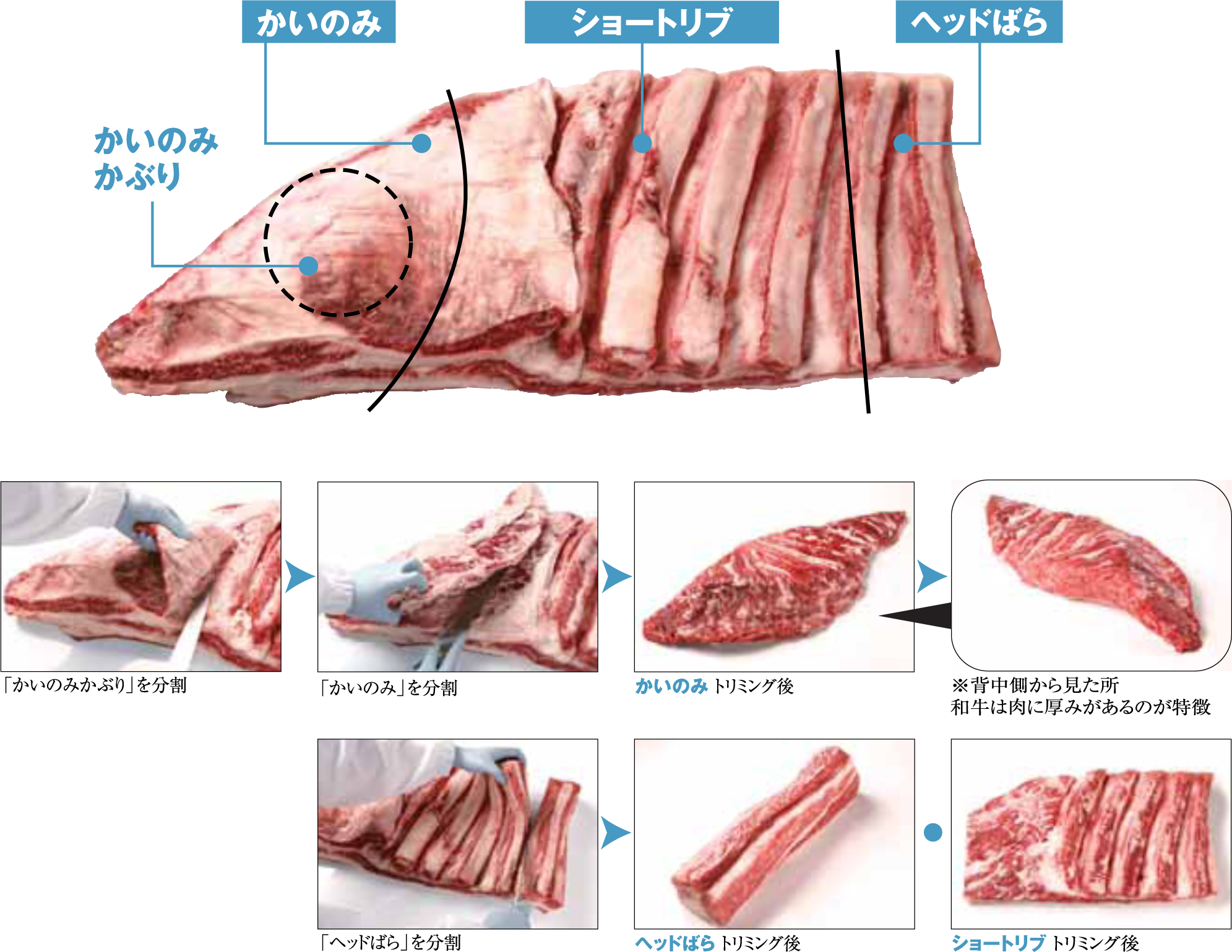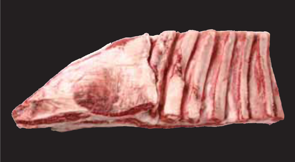 商品提案 Product proposal まえ ロース バラ もも うちばら (2 Rib Short Rib) 原料肉概要 牛の腹にあたる部分の「ともばら」を中央から2分割した上側が「うちばら」です。「ともばら」は運動をよくする部位なので、「うちばら」も繊維や膜が多く、きめも粗い肉質です。しかし、赤身と脂肪が適度に噛み合い、味は濃厚で風味が豊かです。また、「うちばら」には「かいのみ」と呼ばれる、赤身が多く、脂肪交雑も適度にある部分があります。 ※商品化する際は、筋に対して垂直にカットする 料理用途 PRIMAL CUT RETAIL CUT