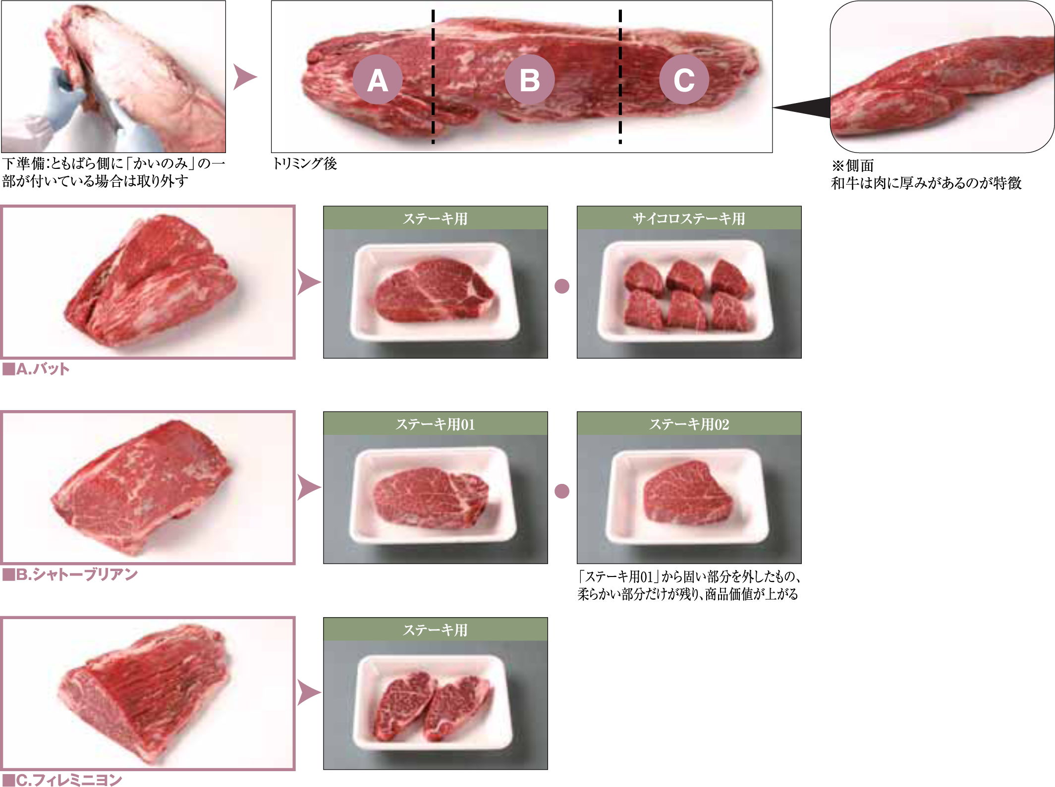 商品提案 Product proposal まえ ロース バラ もも ヒレ (Fillet) 原料肉概要 「ヒレ」は、「ロース」の内側にあり、ほとんど運動しない筋肉ということもあって特に肉質はきめが細かくてやわらかく、脂肪も少ないのが特徴です。枝肉全体から2%程度しか産出されず、嗜好性も高いことから最も価格の高い部位です。変色が早いので注意が必要です。 料理用途